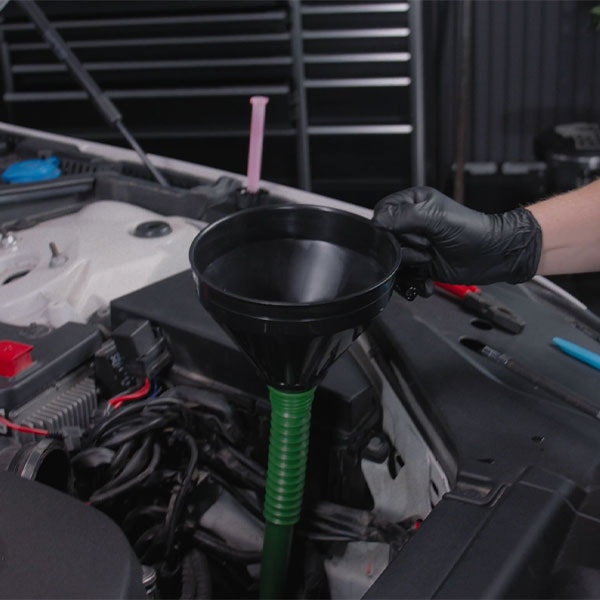 1. Efter att den gamla oljan har tömts ut, fyll på med ny växellådsolja. Använd en tratt med lång pip för att underlätta påfyllningen.