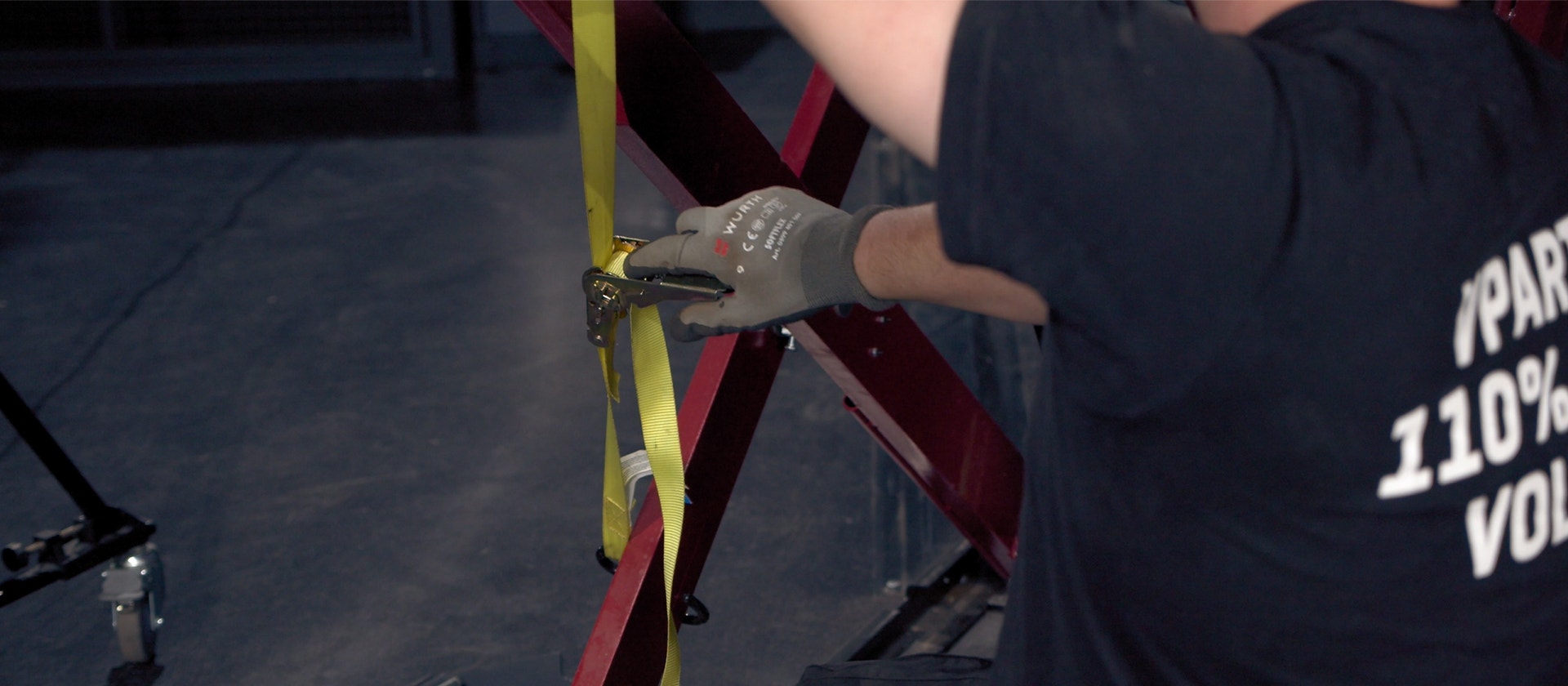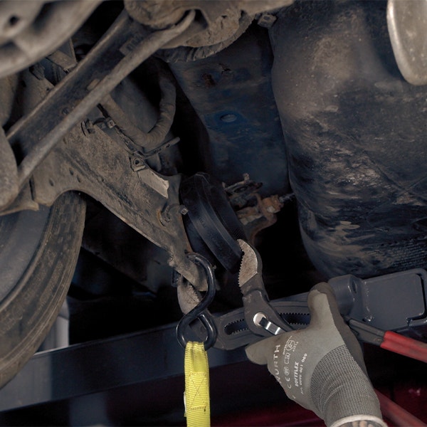 Använd ett spännband för att dra ner länkarmen så det blir lättare att komma åt bussningen.