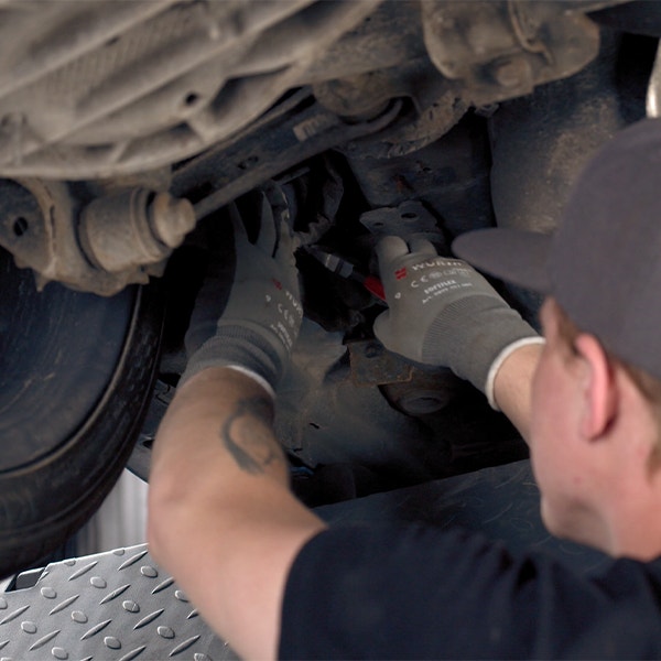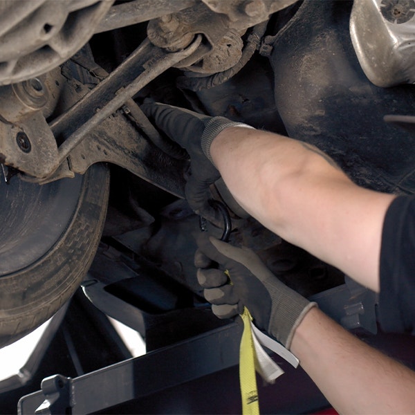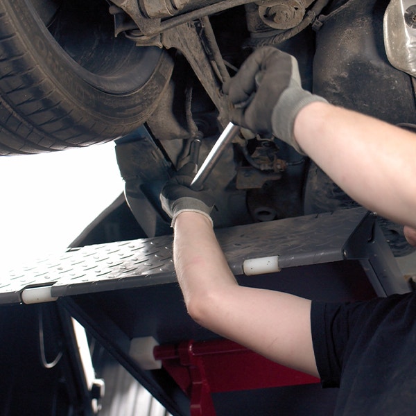 Börja med att lossa plastskyddet som sitter under bussningen.