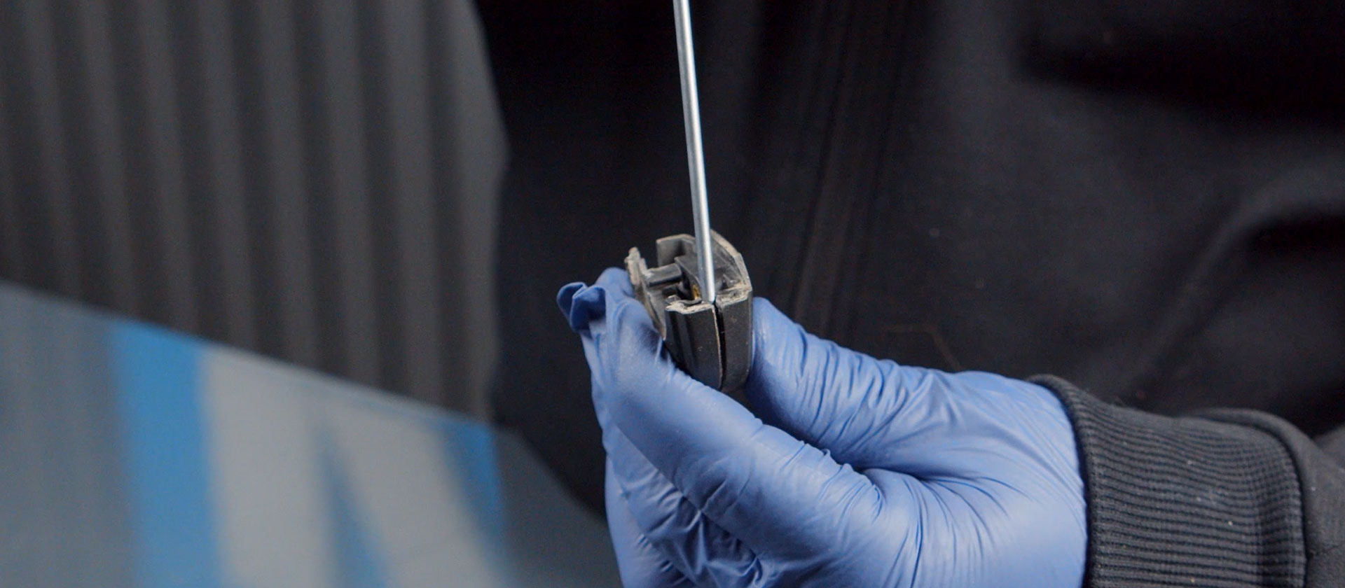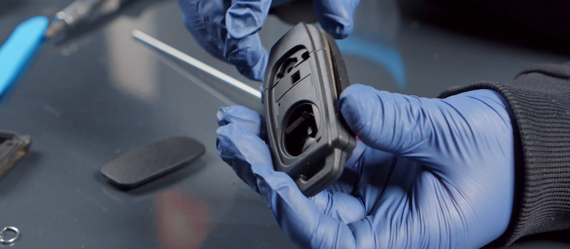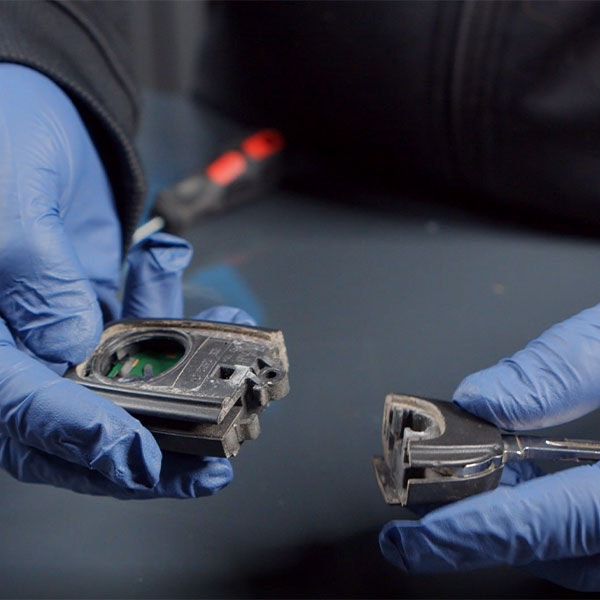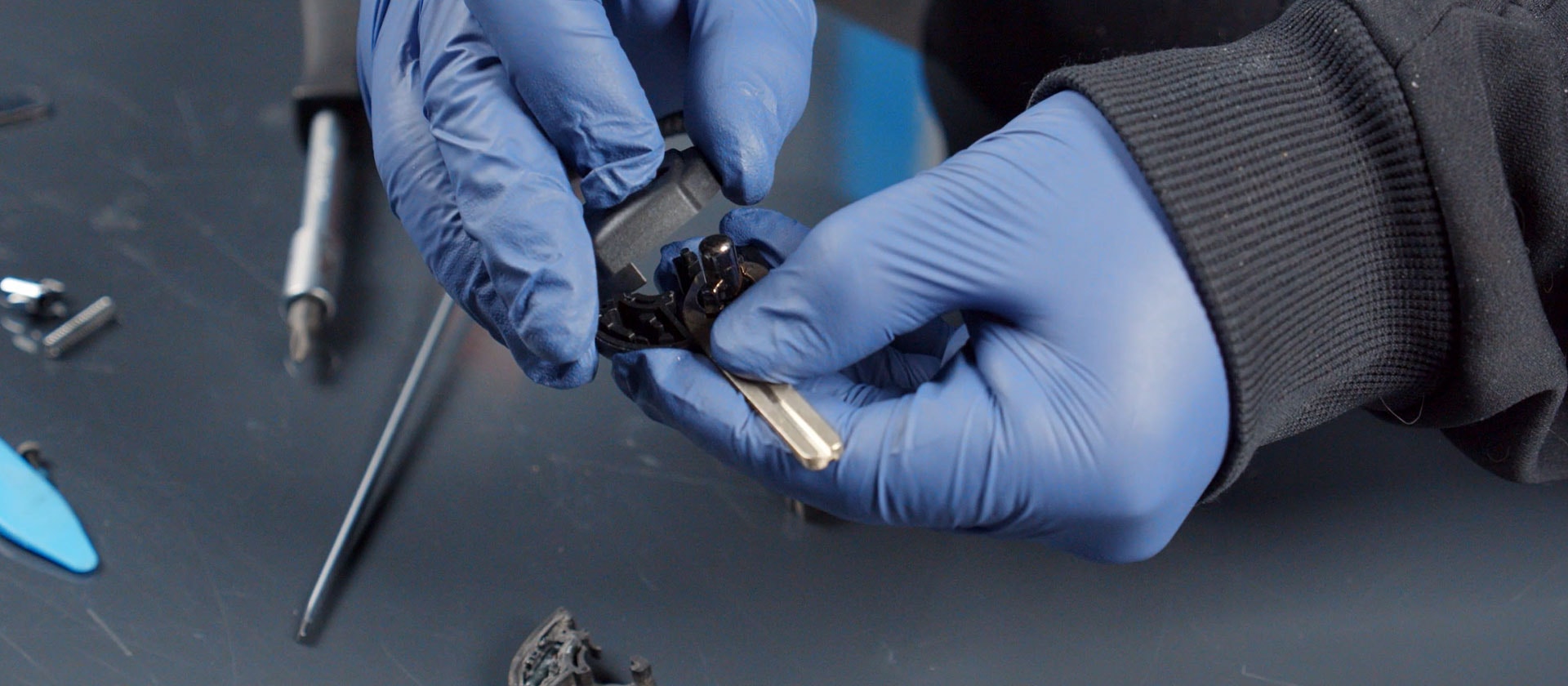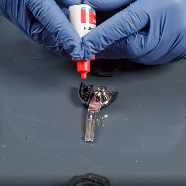 Dela på delen där nyckelbladet sitter, Den är limmad så du behöver bryta upp med en skruvmejsel eller försiktigt såga isär det.