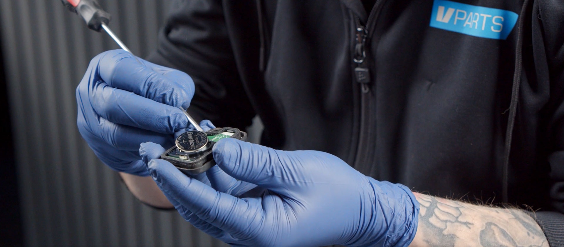 Det är en liten spärr som håller batteriet på plats som du behöver trycka åt sidan. Notera vilket håll plus/minus sitter och byt sedan batteriet (CR2016). Se till att det nya batteriet låser i spärren.