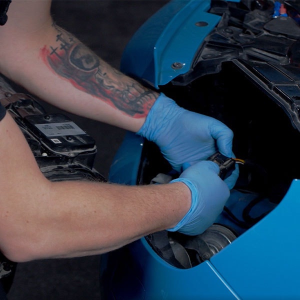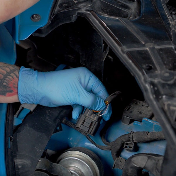 Lossa vänster strålkastare genom att ta bort spärrarna och dela på kontaktstycket, så kommer du åt att dra kablaget vidare för inkoppling.