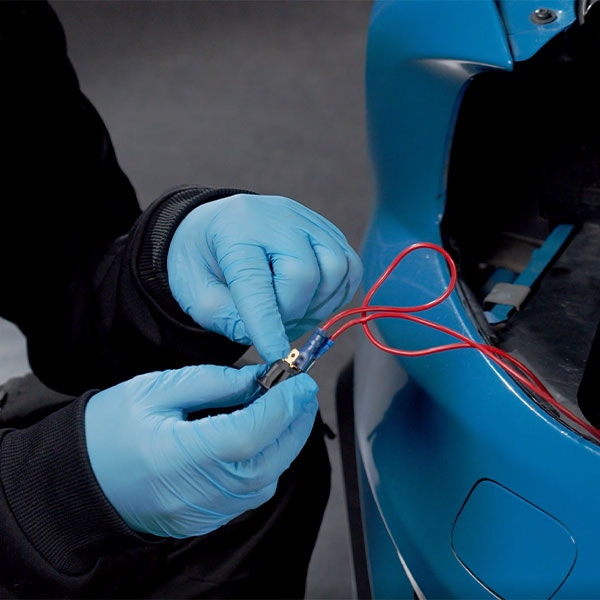 Koppla strömtjuven till den vit/lila kabeln som sitter i kontaktstycket till lyktan.
