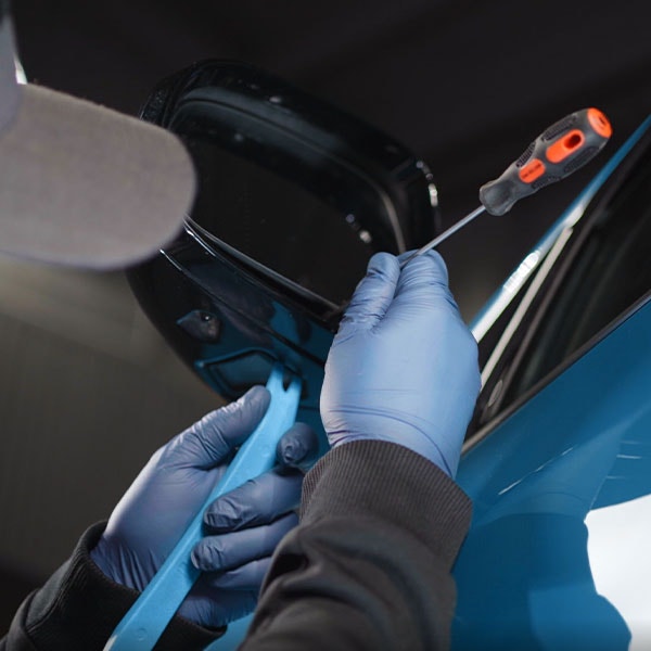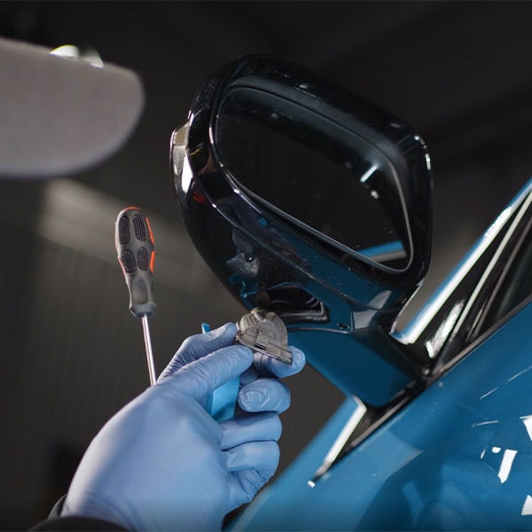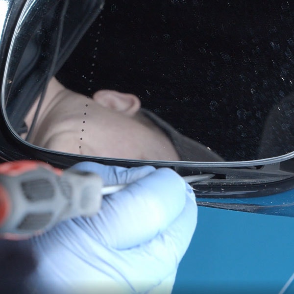 För att få ut lamphuset finns det en liten glipa under spegelglaset som du ska trycka in skruvmejseln i, där innanför finns spärren till lamphuset, samtidigt tar du demonteringskitet och petar i kanten till lamphuset underifrån så att lamphuset kommer nedåt.