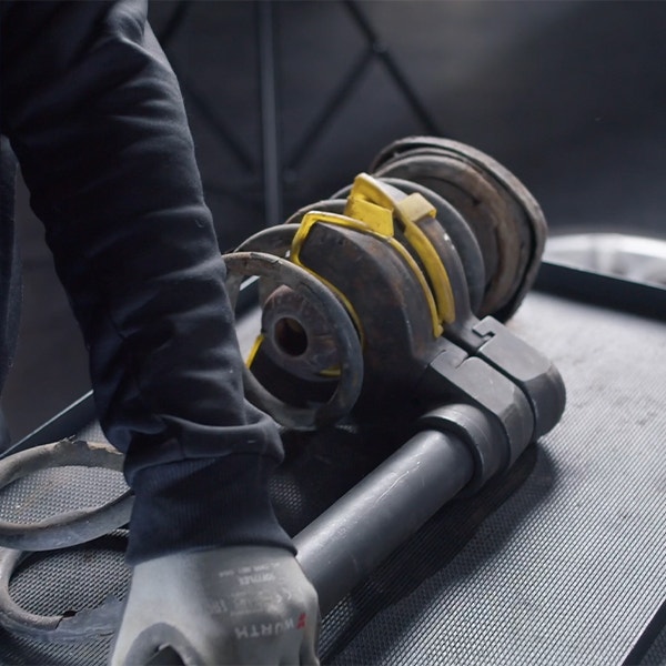 Använd fjäderkompressorn igen för att få tillbaka fjädern på bilen (va noga med att fjädern hamnar rätt i fjäderkompressorn).