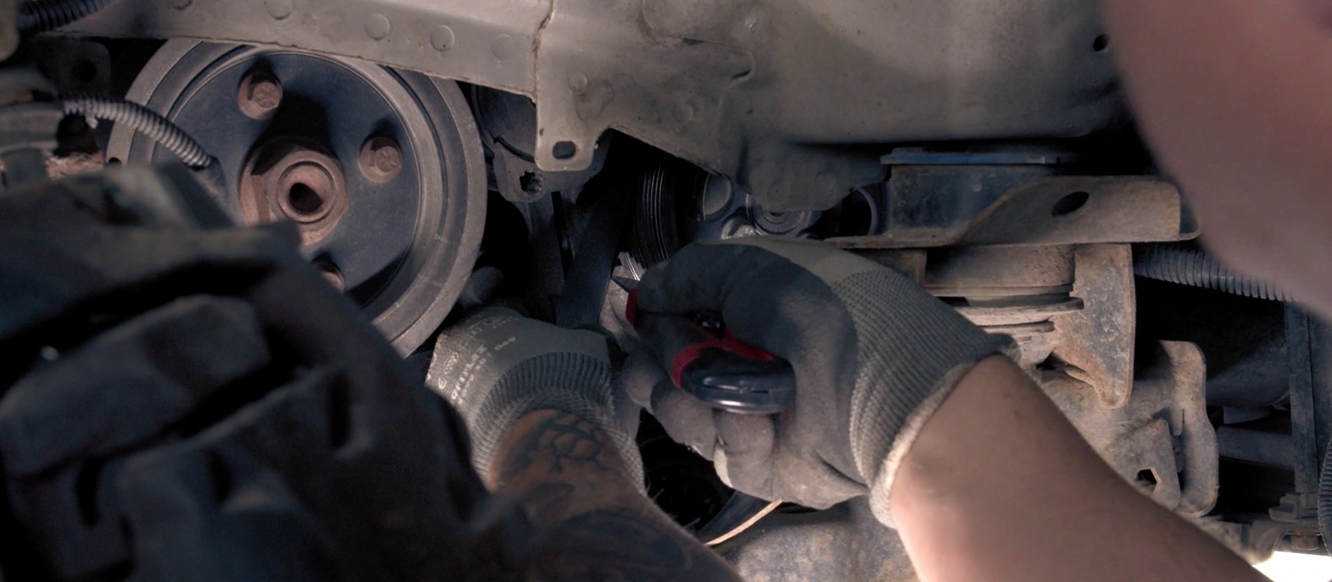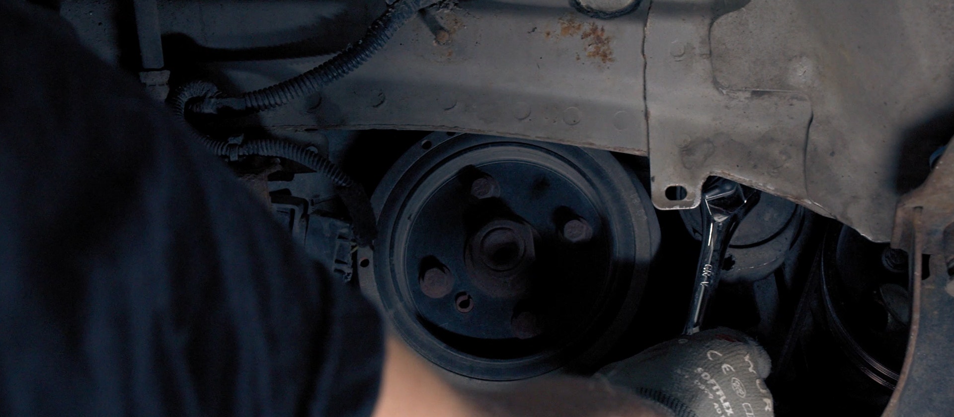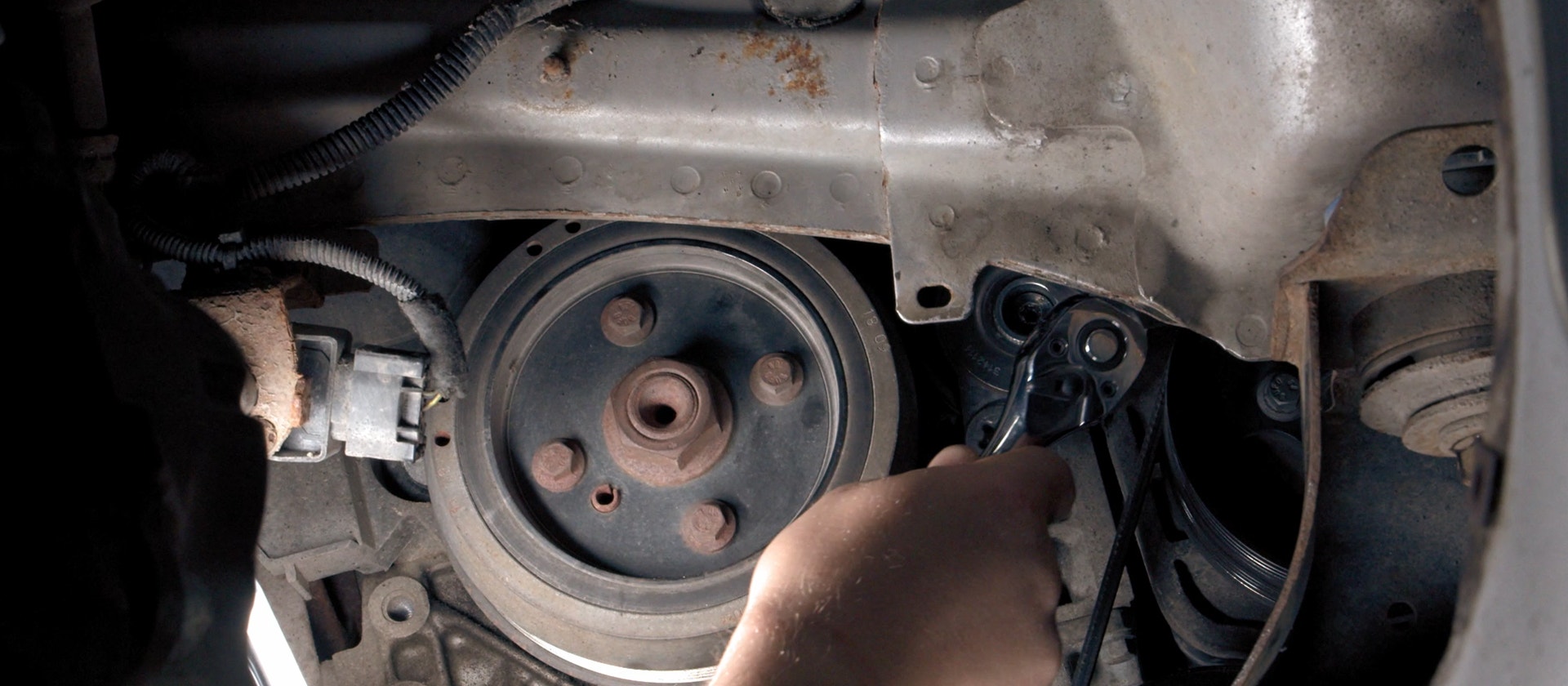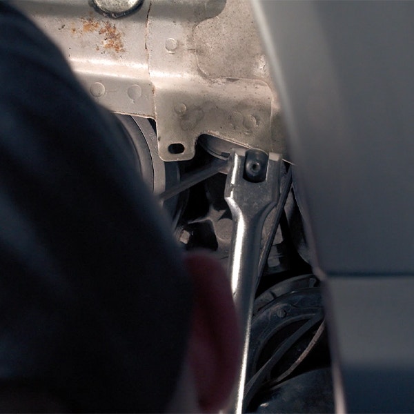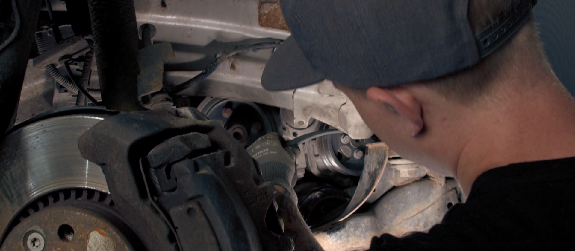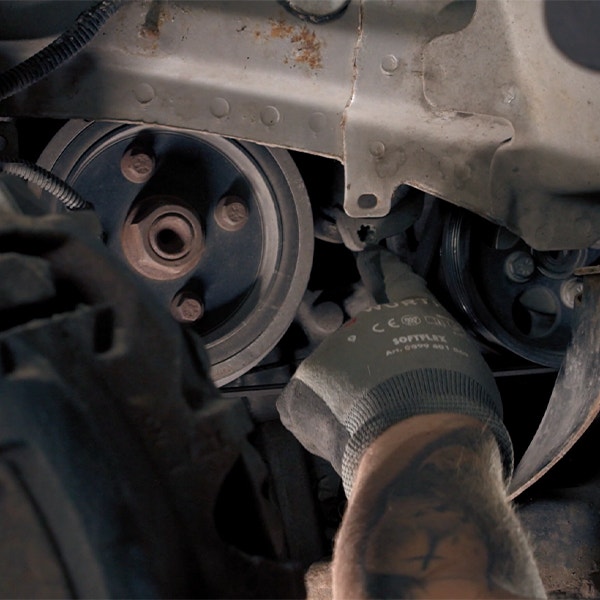 Börja med att lossa hjulet och innerskärmen. Innerskärmen sitter i 4st torx 25 och 2st plastmuttrar 10mm. Vik sedan bak hela innerskärmen så att du kommer åt remmen.