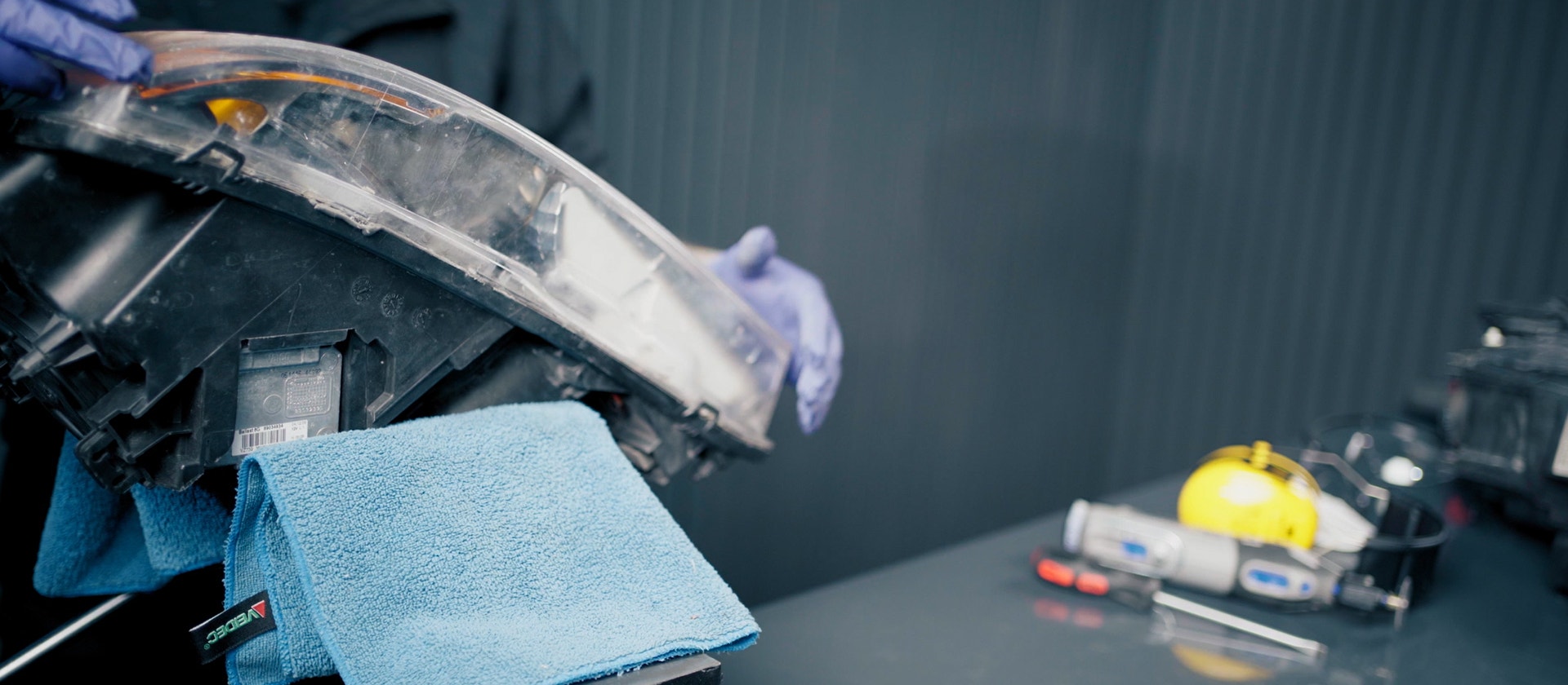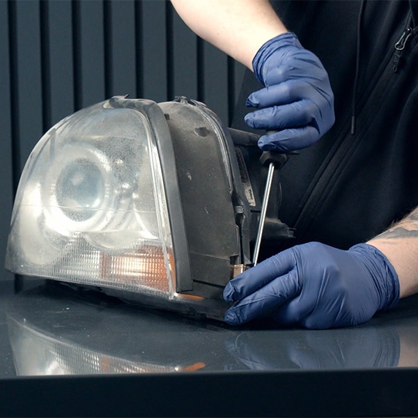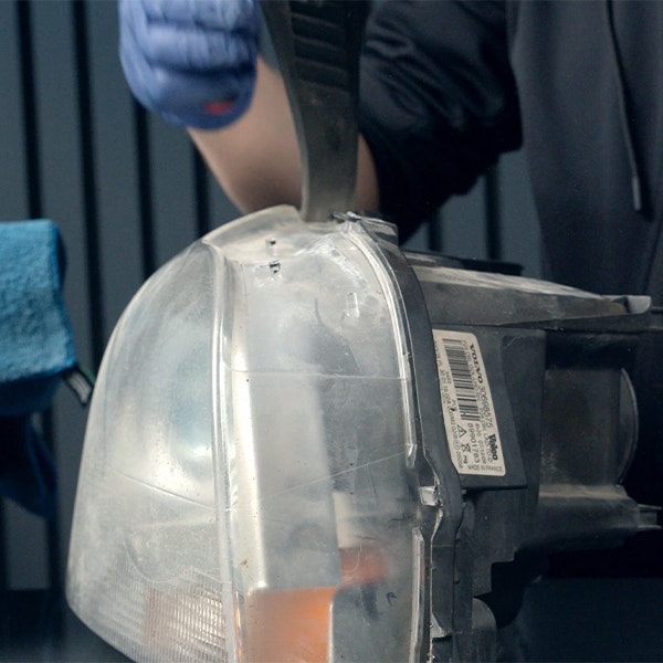 Sätt fast strålkastaren i ett skruvstäd, använd mikrofiberdukar för att skydda strålkastarhuset.