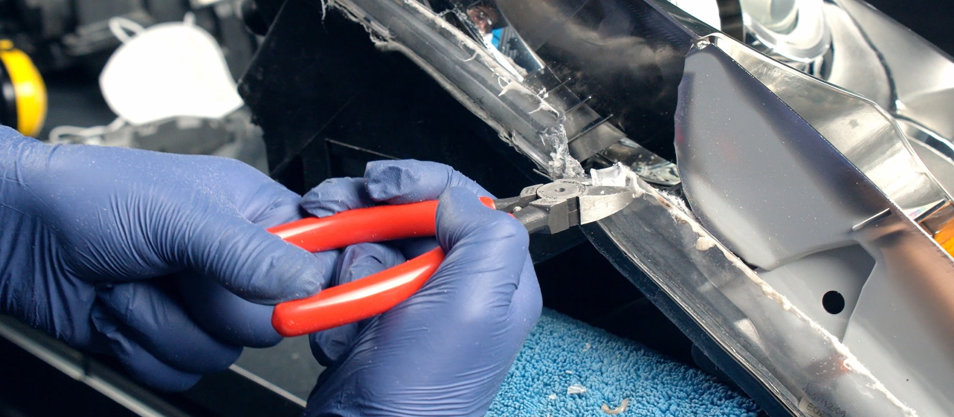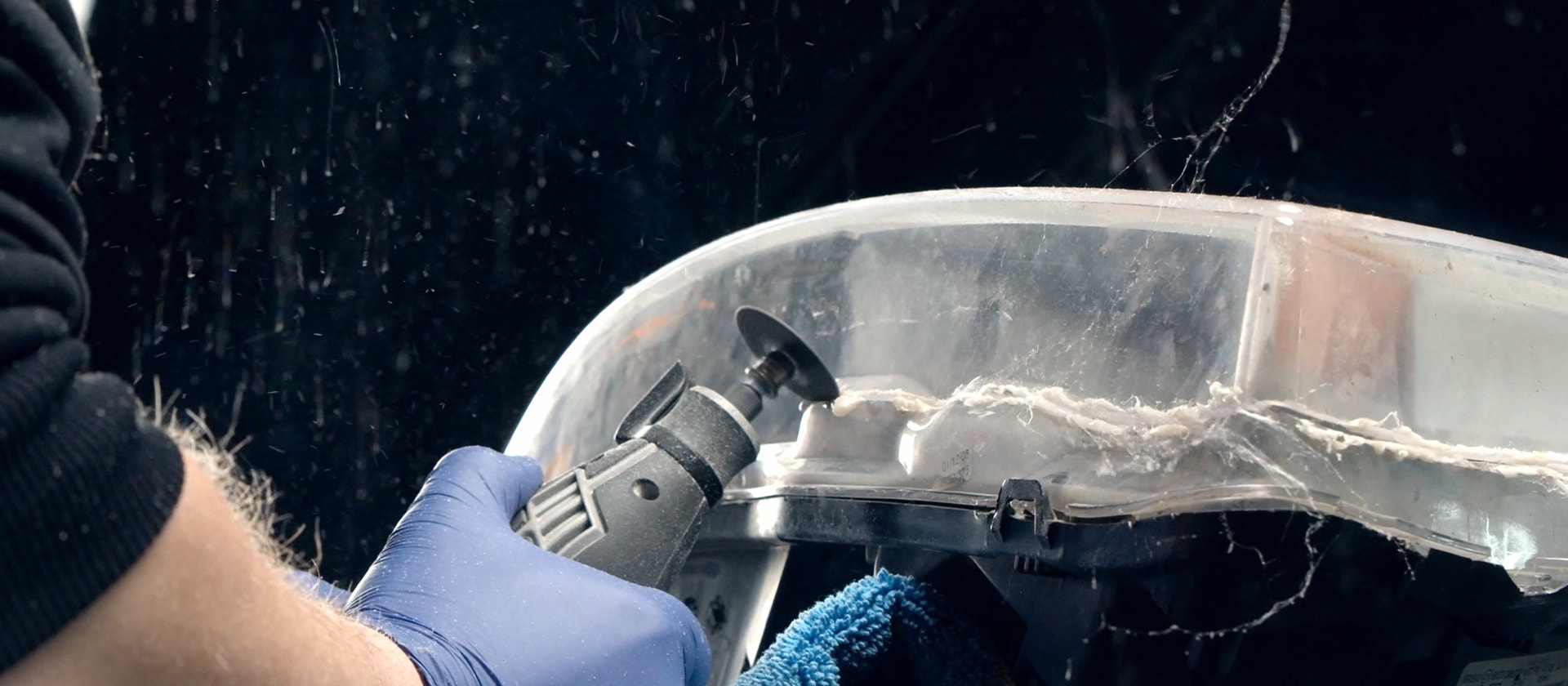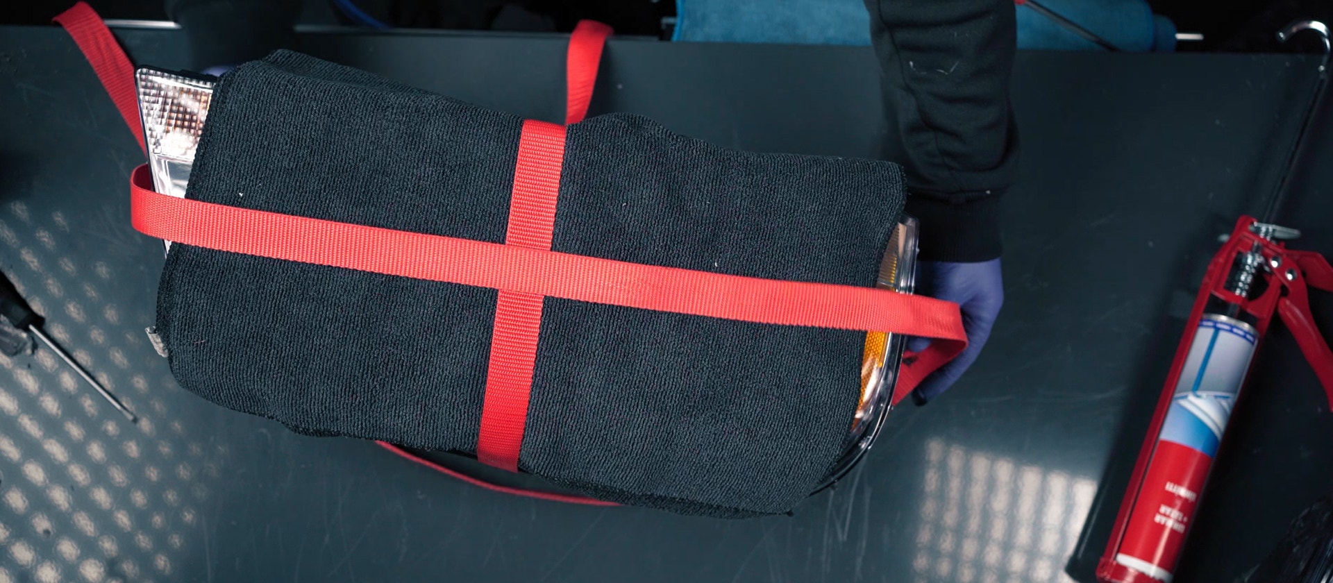 Lägg dukar över och under strålkastaren för att skydda nya linsen, dra sedan åt strålkastaren med spännband medan limmet härdar.