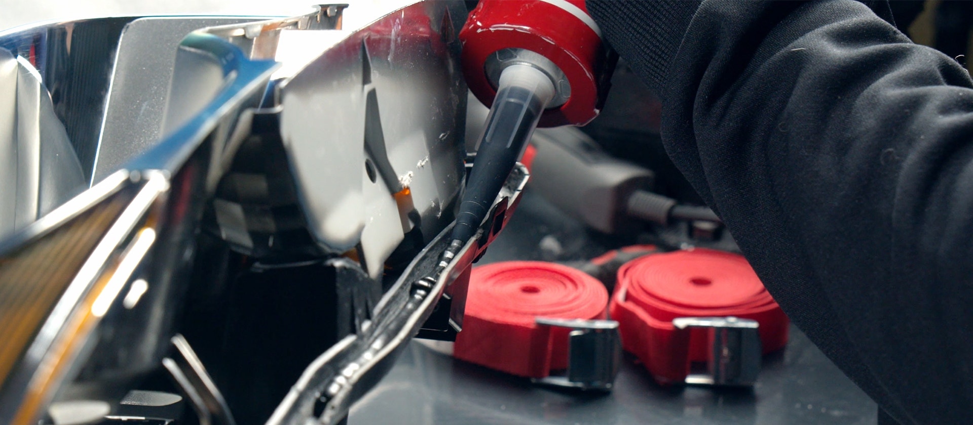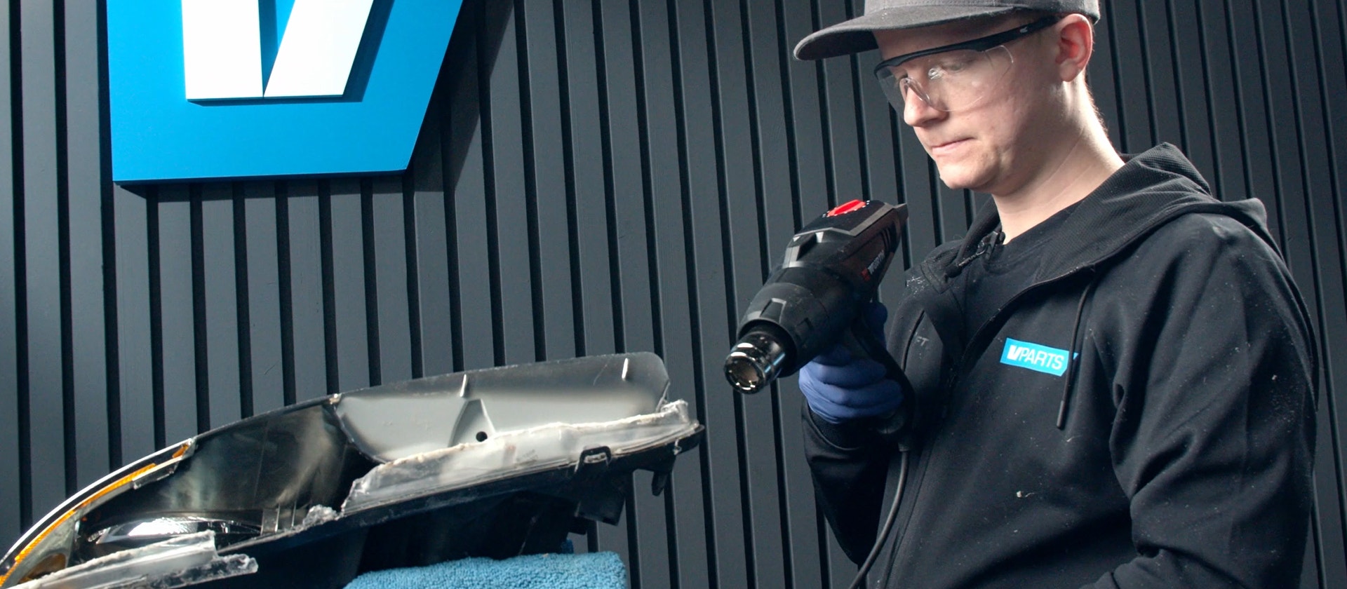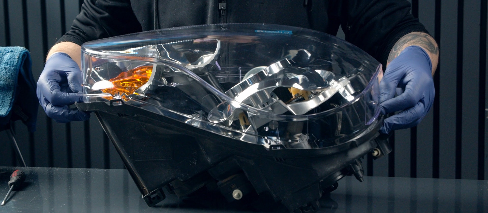 Lägg dukar över och under strålkastaren för att skydda nya linsen, dra sedan åt strålkastaren med spännband medan limmet härdar.