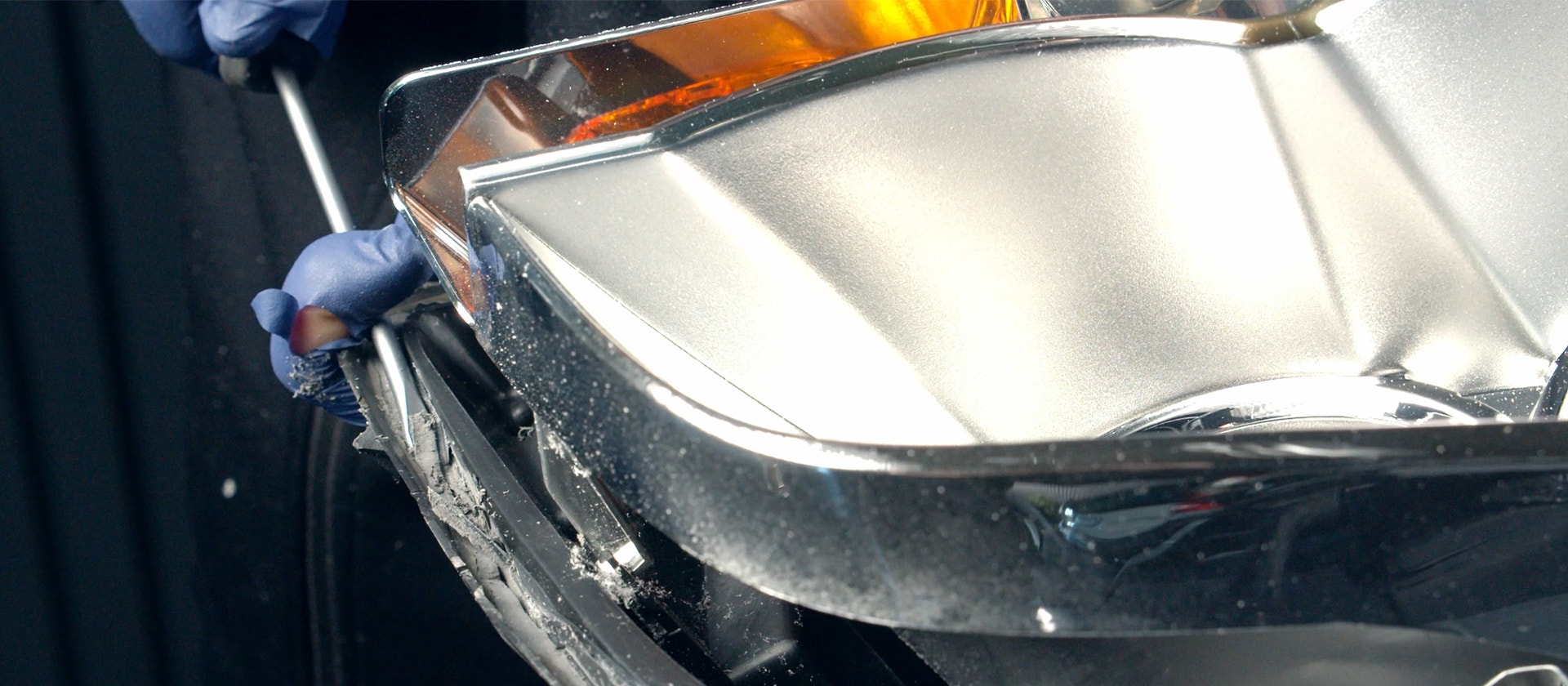 Blås rent strålkastaren med tryckluft. OBS! Röra inte kromet i lyktan, det blir lätt fula märken som inte går att få bort.