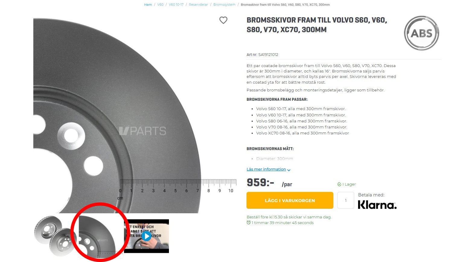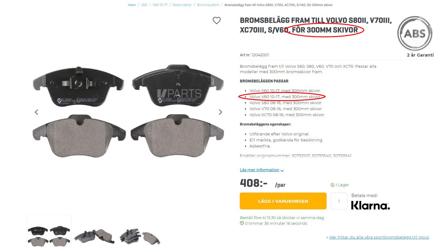 I detta exempel ska vi ta fram bromsklossar fram till våran V60 från 2014 och med informationen om storleken på din bromsskiva kan du även välja rätt bromsbelägg, bromsok, bromsslangar och övriga bromsdetaljer som är olika på grund av bromsarnas storlek.