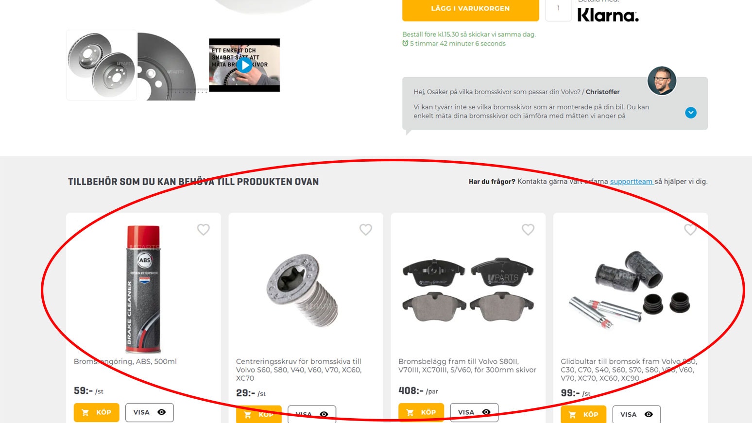 Under varje produkt har vi samlat och valt ut bra tillbehör och produkter som är rätt för den del du tittar på. Så till dessa bromsskivor ligger rätt bromsbelägg & glidbultar som exempel.