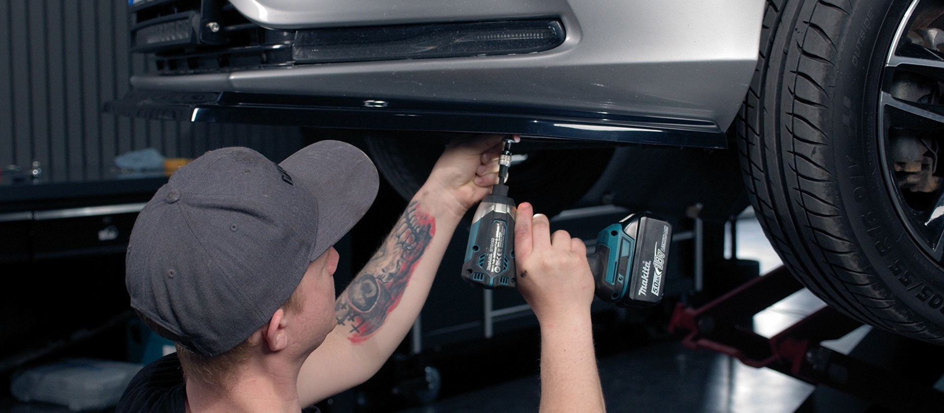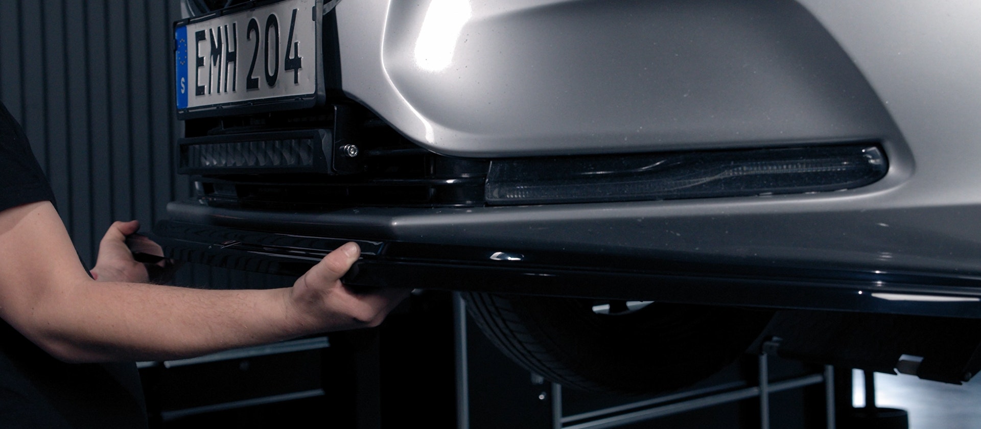 Vi kommer inte montera denna add-on läpp med skruvarna som följer med, vi kommer gör det på ett enklare sätt. I satsen följer det med skruvar och låsmuttrar och för att montera dessa på bilen behöver vi plocka av stötfångaren. I denna guide kommer vi visa ett enklare och snabbare sätt att montera läppen på med hjälp av krysskruvar, brickorna som medföljer i satsen och lim.