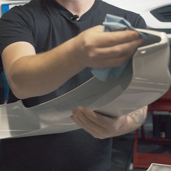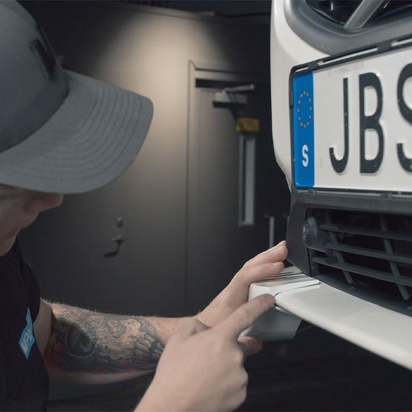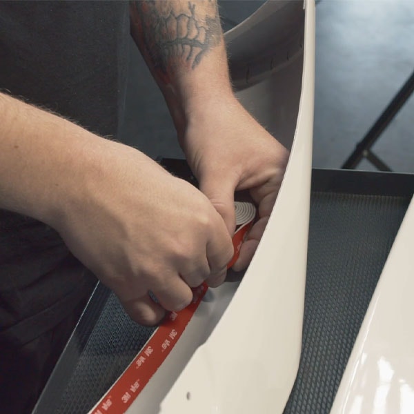 Sätt den första delen på plats, börja med att sätta läppen vid hjulhuset och sätt tryck samtidigt som du sätter läppen på plats. Ett tips är att hålla läppen lite ovanför så att inte tejpen fastnar medan du justerar in den. Repetera på den andra sidan.