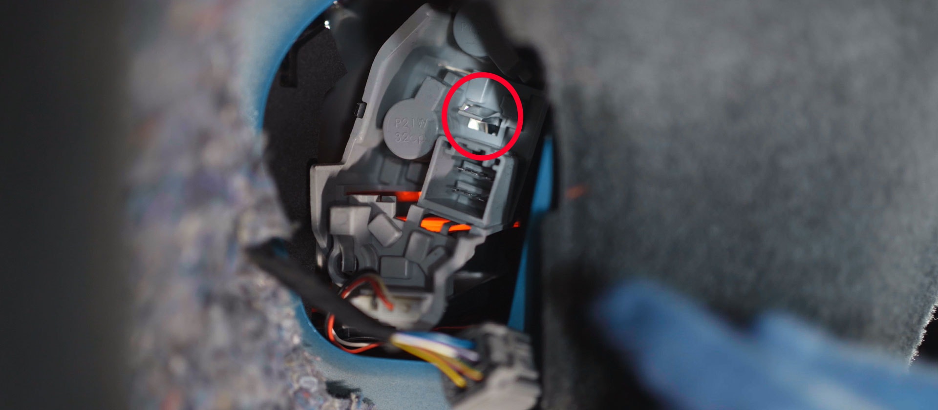 På vår V60 sitter lamphållaren sitter i en spärr (se bild). Tryck ner spärren och dra sedan ut lamphållaren, annars lossar du bara lamphållaren.