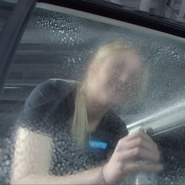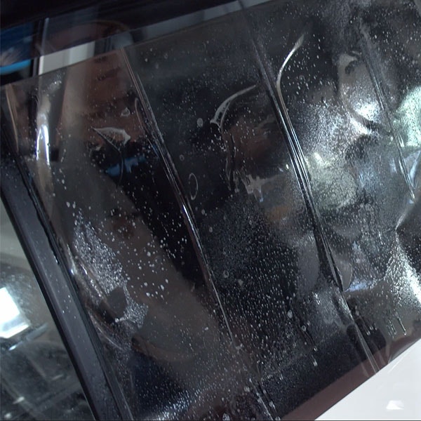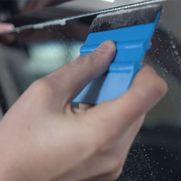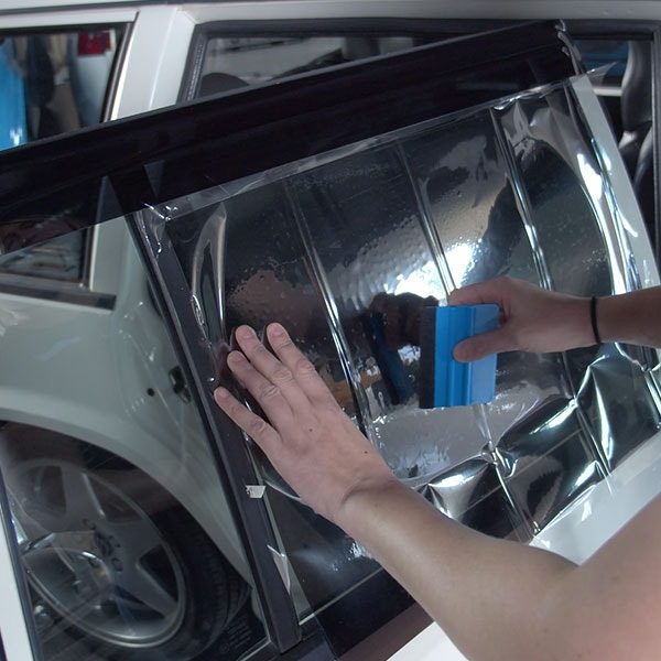 Börja med att lägga solfilmen på utsidan av bilrutan, detta görs genom att spraya såpvatten som håller filmen på plats. justera och se till att den passar perfekt mot rutan. Det som är viktigt nu är att skyddsfilmen är utåt.