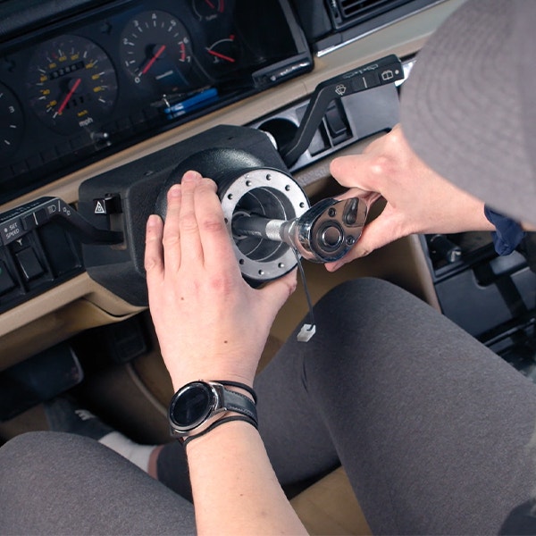 Skruva fast ratten i navet. Tänk på att inte dra åt skruvarna för hårt till en början, efterdra skruvarna när alla är på plats.