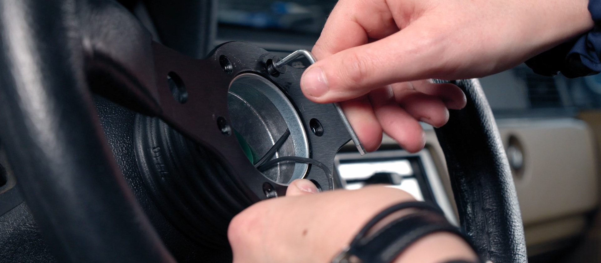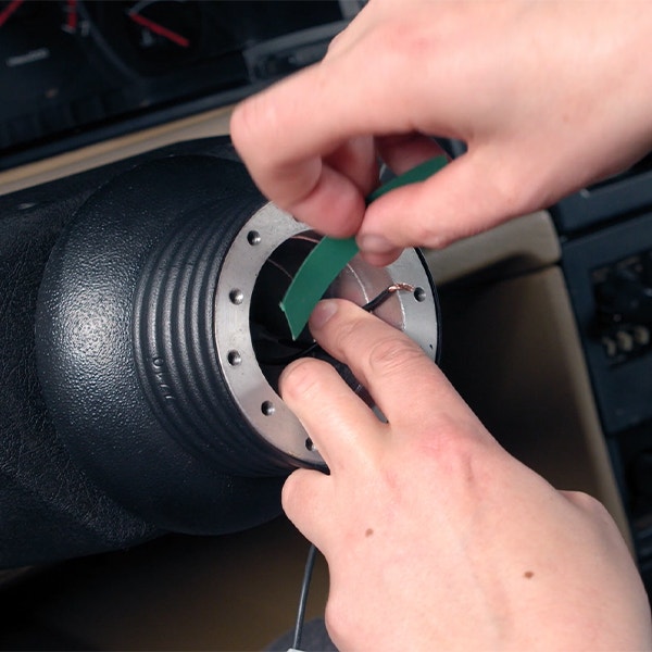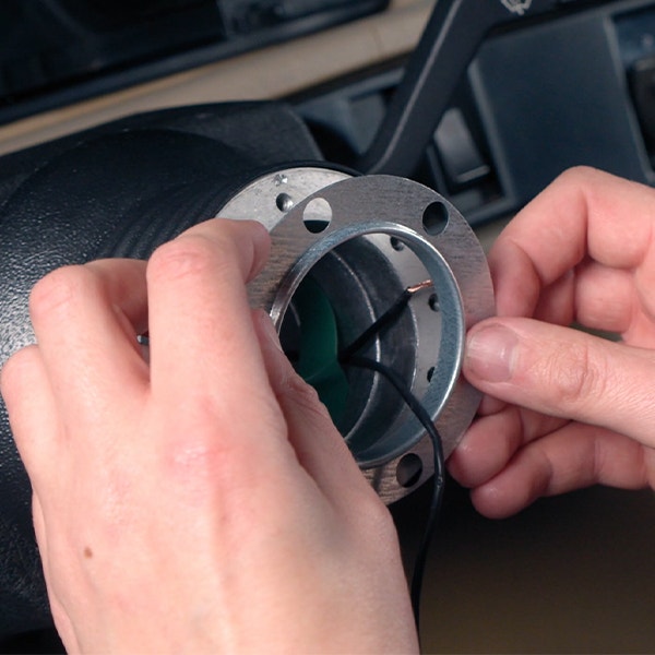 Montera metallbrickan som är jord för tutan, använd en tejpbit för tutkabeln så underlättar det arbetet med att montera tillbaka ratten senare.