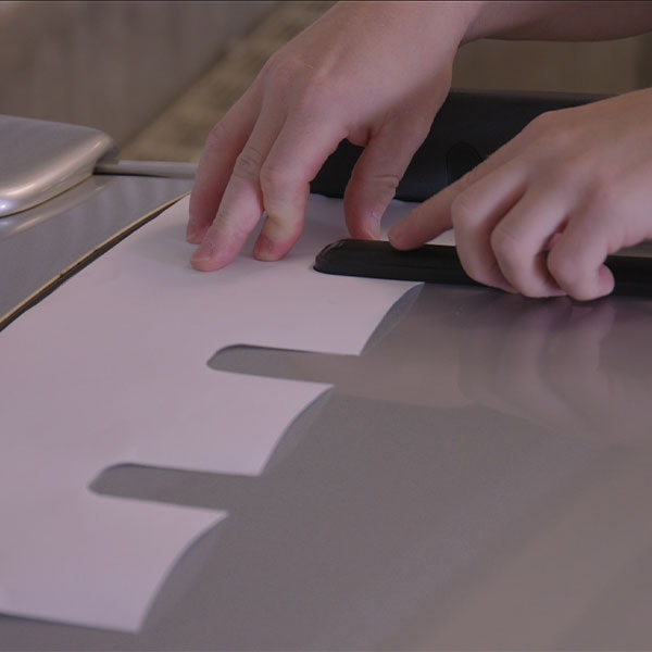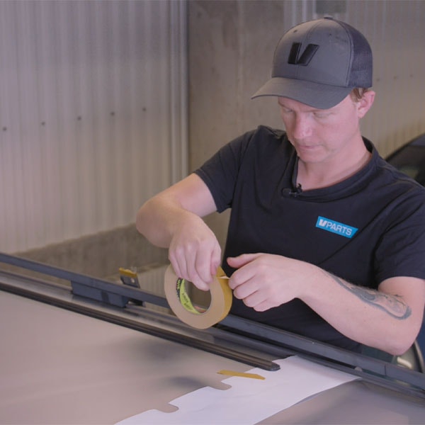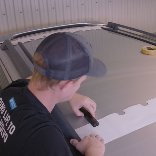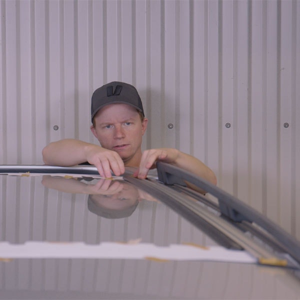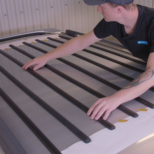 Den bakre mallen ska placeras där taket slutar och bagageluckan börjar. Den ska ligga emot takrailsen på båda sidor för att linjera korrekt. Placera mallen noggrant så att ribborna kommer att ligga i perfekt linje med takets konturer.
