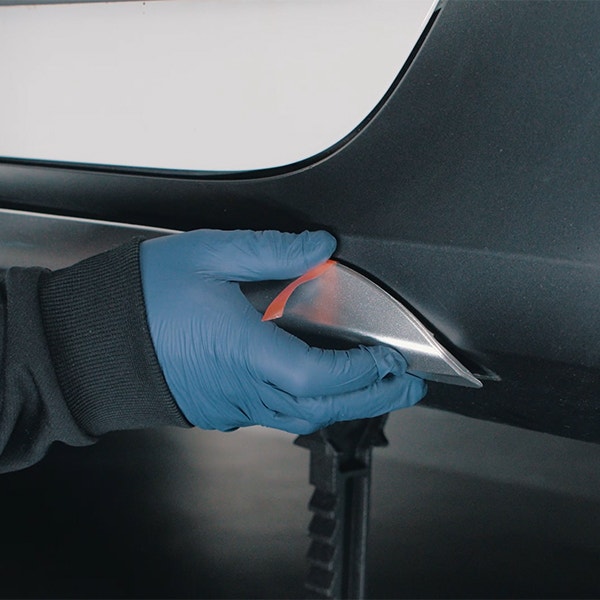 Börja med att ta bort en bit av skyddet som sitter på tejpen i en hörnet och börja sätt fast side scuffen från en sidan till den andra. Dra bort mer och mer av skyddet på tejpen medan du pressa in side scuffen mot bilen.