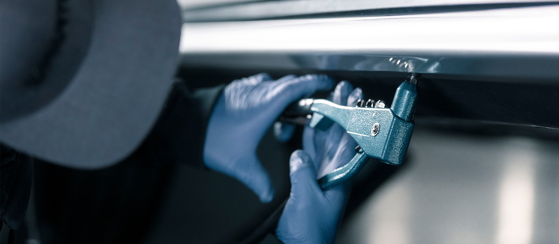 Sätt fast popnitarna i hålen du precis borrade. Popnitar följer med när du köper side scuffs hos oss!