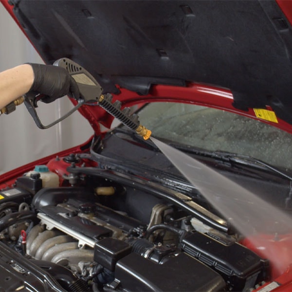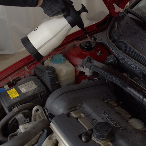Skölj försiktigt: Använd en trädgårdsslang eller högtryckstvätt på låg inställning för att skölja av motorutrymmet. Håll avståndet för att undvika att vatten tränger in i kontakter och elektroniska komponenter.