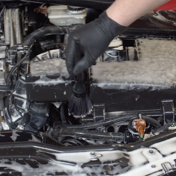 Använd alkalisk avfettning: Spraya alkalisk avfettning över hela motorutrymmet. Detta medel är mildare och tar bort damm, jord och annan organisk smuts. Använd en borste för att skrubba bort envis smuts.